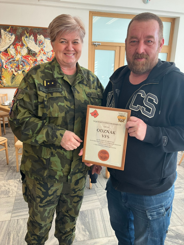 Válečný veterán Stanislav Holotík a provozovatel muzea MILITARY MUZEUM generála SERGĚJE JANA INGRA VLKOŠ u KYJOVA Petr Něnička převzali z rukou ředitelky Agentury pro podporu válečných veteránů MO odznak Vojenského fondu solidarityv Městském kulturním středisku v Kyjově – ocenění, které si zaslouží jen ti nejvýznamnější podporovatelé.